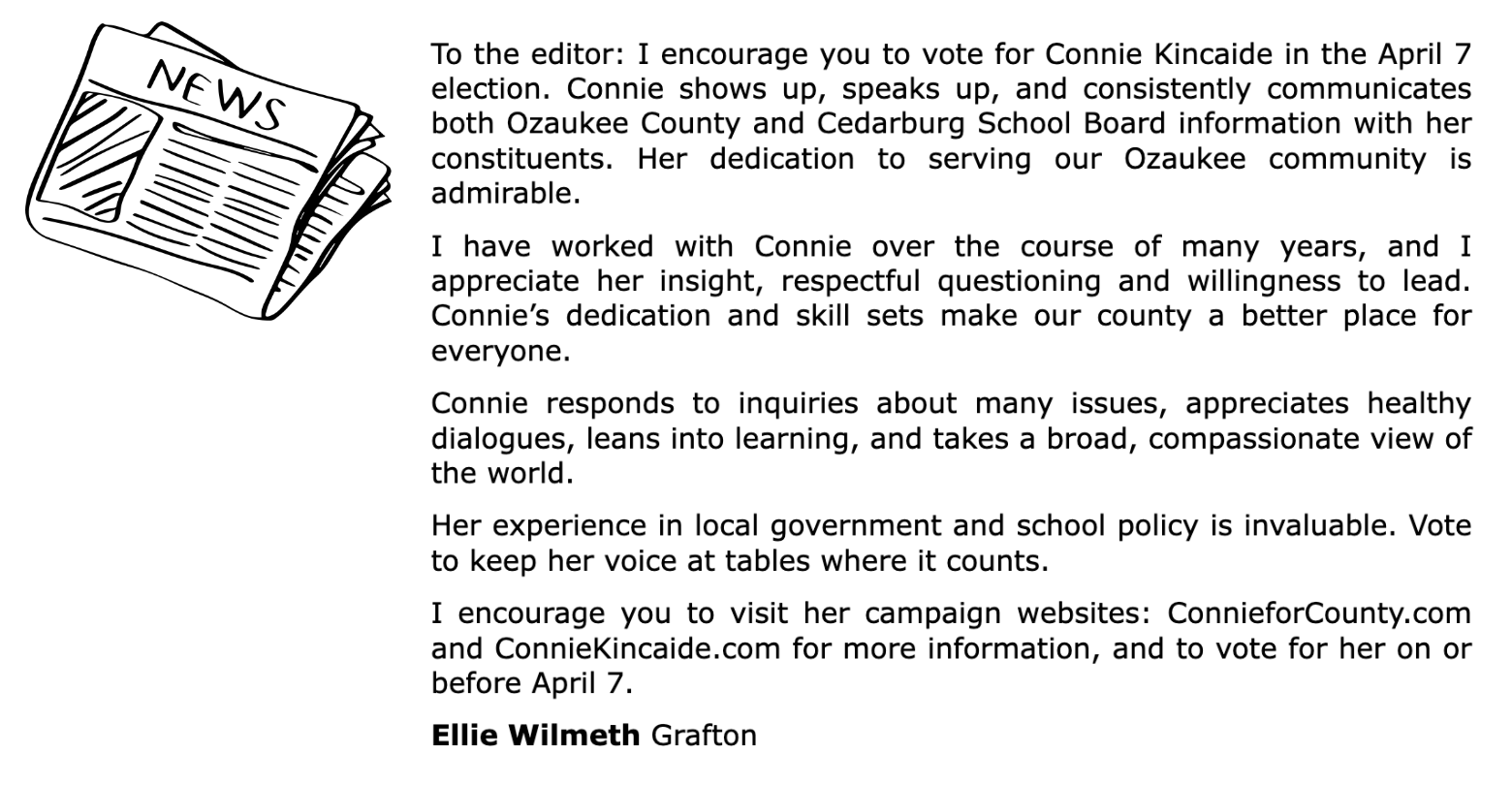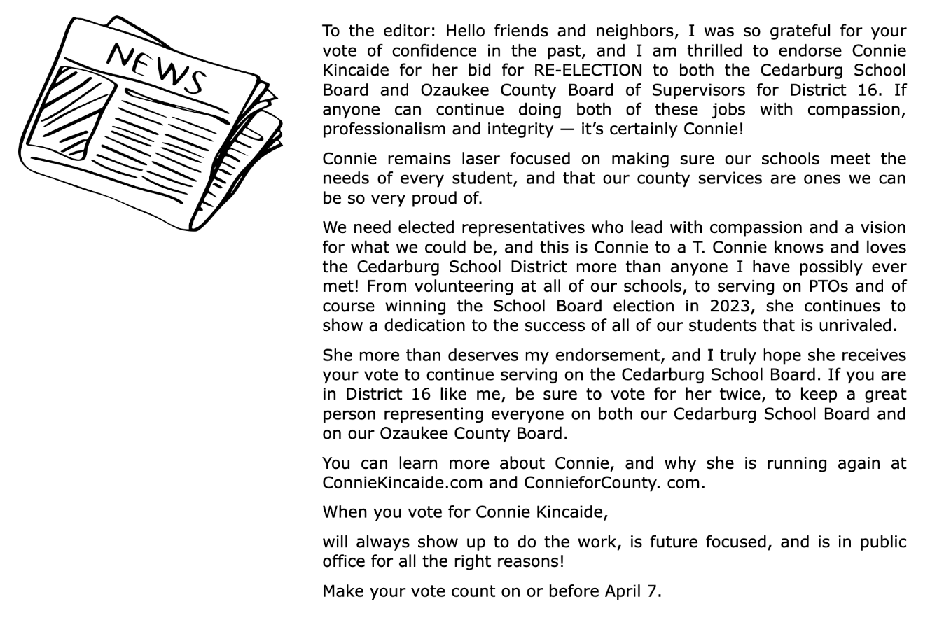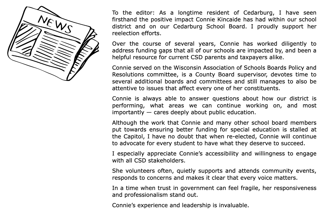 “Welcome! You're in the right place to learn more about who I am, what I value, and why I believe I am the right choice to continue representing our community on the Cedarburg School Board.” -Connie Kincaide